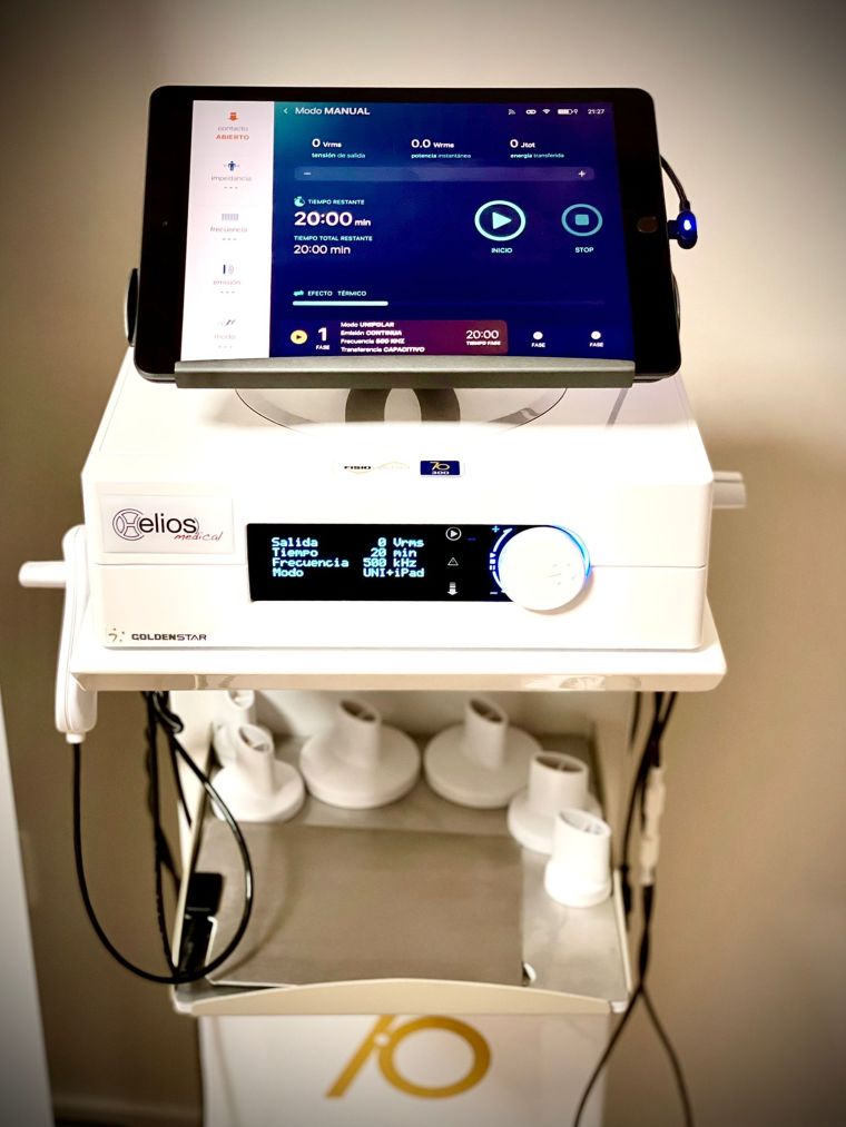 Es un dispositivo de electromedicina que aplica una corriente con un rango de frecuencias de 300 kHz a 1 MHz para estimular térmica, mecánica y químicamente los tejidos con diferente resistividad, sin generar contracción muscular y llegando a zonas superficiales y profundas.