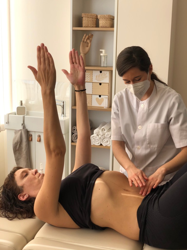 Observamos que tipo de patrón respiratorio predomina, si hay retracciones musculares, valoramos las vísceras, las posibles cicatrices, diástasis (separación de los rectos abdominales más de 2cm), si el abdomen es competente ante esfuerzos como la tos, el estornudo, la risa… y como se comporta a nivel motor cuando realizamos algún ejercicio.
